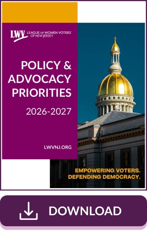 This document outlines our key policy priorities for the 2026–2027 legislative session. Developed through LWVNJ membership engagement, these priorities reflect a shared commitment to protecting voting rights, advancing racial justice, expanding access to critical resources, strengthening representation, and ensuring transparency and accountability in New Jersey’s government. This agenda will guide our advocacy, education, and coalition work over the next two years, ensuring we remain focused, strategic, and responsive to community needs.